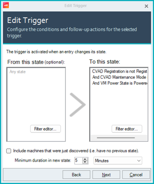 A user asked if the Director Trigger pack can capture an unregistered instance of the server. It can, but the trigger must use "Minimum duration in this state" instead of Uptime. The user set Minimum duration to 10 minutes and removed Uptime.