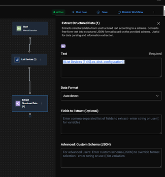 c. Inside the loop I iterated through the devices and was able to add serial_number and os_disk_configuration to the Excel file. I used this value: [[{{List Devices (1) [i].serial_number}}, {{List Devices (1) [i].os_disk_configuration.drive_letter}}]]. The os_disk_configuration looks something like this: [{"drive_letter":"C:\","volume_label":"Windows","format":"NTFS","root_directory":"C:\","drive_type_string":"Fixed","free_space":837533782016,"capacity":1013309239296,"encrypted":1}]. This gives me more info than I need. I just want to add free_space and capacity. I tried something like {{List Devices (1) [i].os_disk_configuration.drive_letter.free_space}}, but that didn’t work.